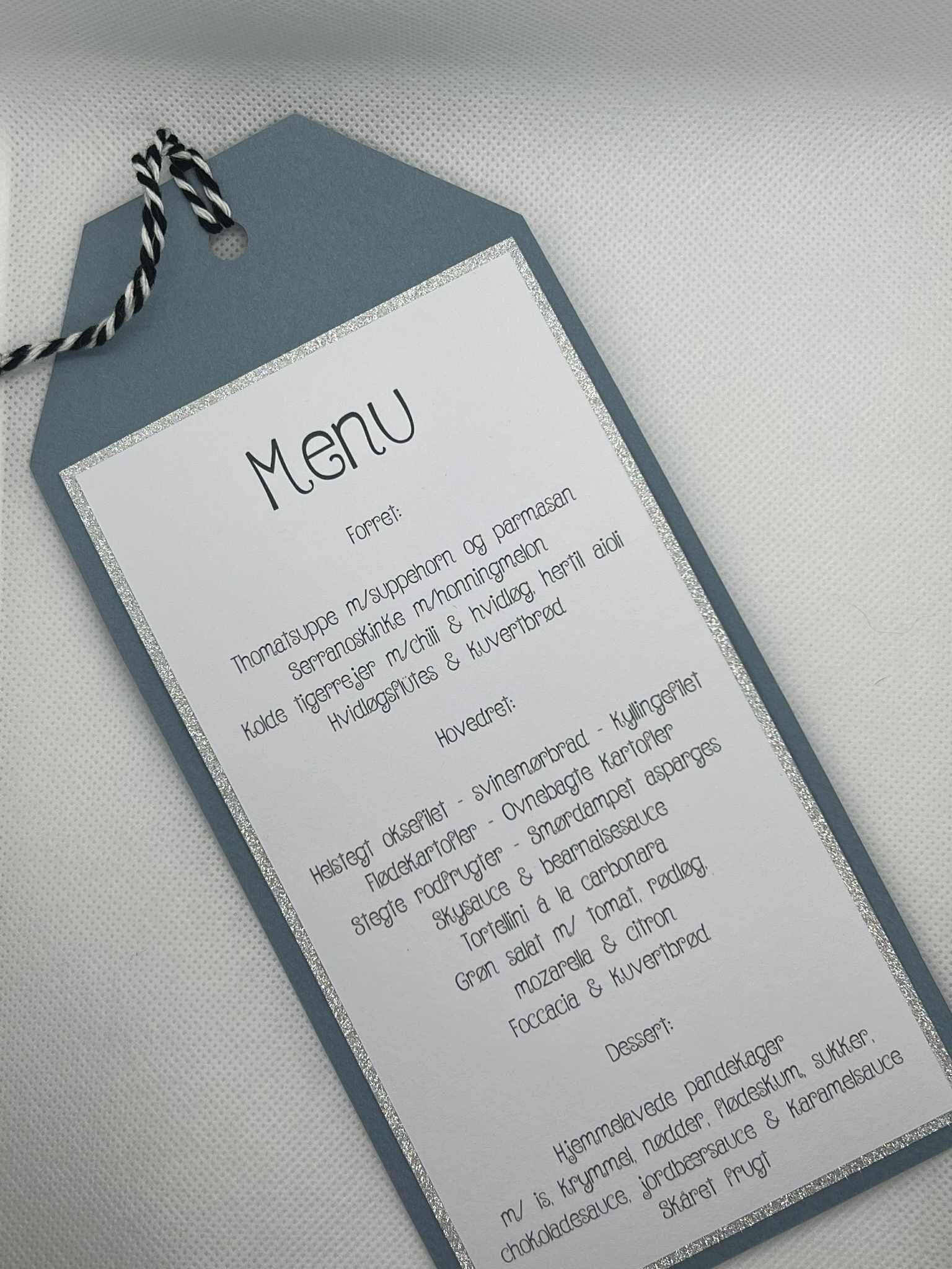 Menukortet er lavet i tre lag, baggrund i farvet karton, baggrund i glimmerkarton og øverste lag er hvid karton med menuen på.